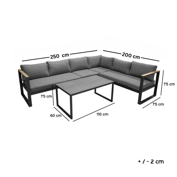 Dimensions of the corner sofa: Width 250 cm – Length 200 cm – Depth 75 cm – Height 75 cm