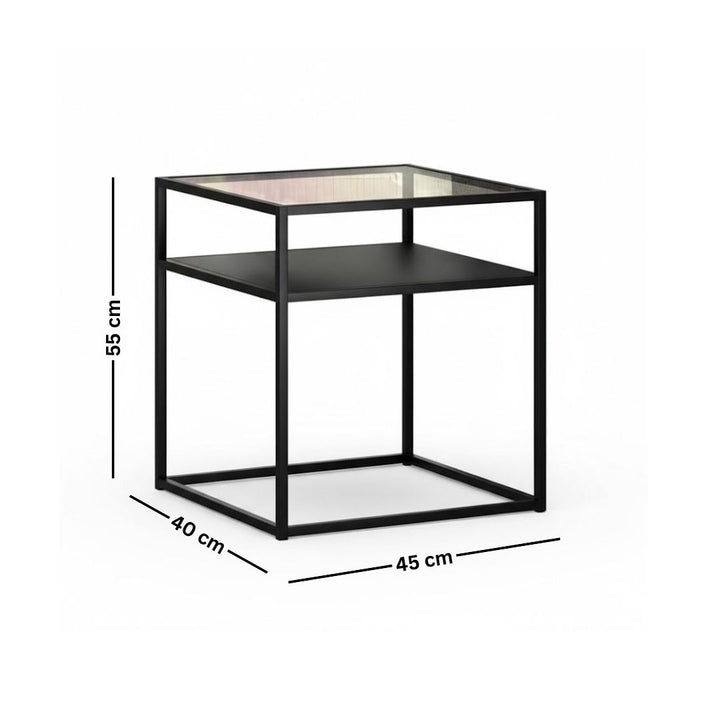 Combine practical elegance and high quality with the ZSL-003 table made of steel coated with electrostatic oven paint resistant to rust and moisture. It features a sophisticated design combining a transparent glass top and a MDF wood bottom surface to provide the perfect blend of luxury and practicality. Its sleek square design makes it ideal for use as a side table next to the sofa or bed, adding a distinctive modern touch to any interior space.