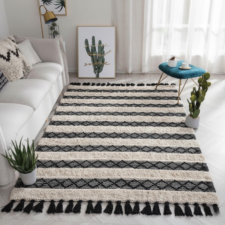 مصنوعة يدويًا بعناية من صوف طبيعي عالي الجودة يمنح ملمسًا ناعمًا ومريحًا، وتأتي بتصميم متعدد الألوان (Multiple Colors) يضفي لمسة ديكور أنيقة ومفعمة بالحياة على أي مساحة داخلية.