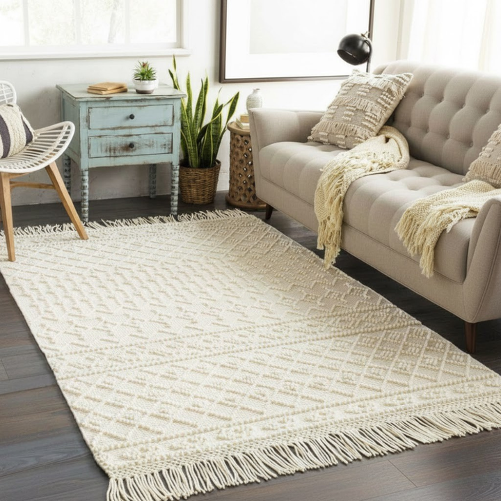 سجاد هاند ميد صوف موديل HAZ-012 مصمم بعناية فائقة من صوف طبيعي 100٪، وبيتميز بشغل يدوي متقن يضيف قيمة وجمال لأي غرفة. ملمس ناعم، تصميم راقي، وألوان هادية بتخليه مناسب لكل الديكورات سواء في غرفة المعيشة أو النوم أو الريسيبشن. اختار الجودة والشياكة اللي تكمّل بيتك مع أوسكار فرنتشر.