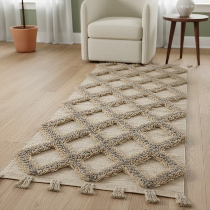سجاد هاند ميد صوف موديل HAZ-077 بيتميز بخامة صوف طبيعية 100٪ وشغل يدوي عالي الدقة يمنح السجادة مظهر فاخر وجودة استثنائية. تصميمها الهادئ والمتناسق بيخليها مناسبة لأي غرفة سواء في المعيشة، النوم أو الريسيبشن، وبتضيف إحساس رائع بالدفء والراحة. لو بتدور على قطعة فنية تعيش معاك سنين وتضيف لمسة راقية وجذابة لبيتك، فأوسكار فرنتشر بيقدم لك الاختيار المثالي.