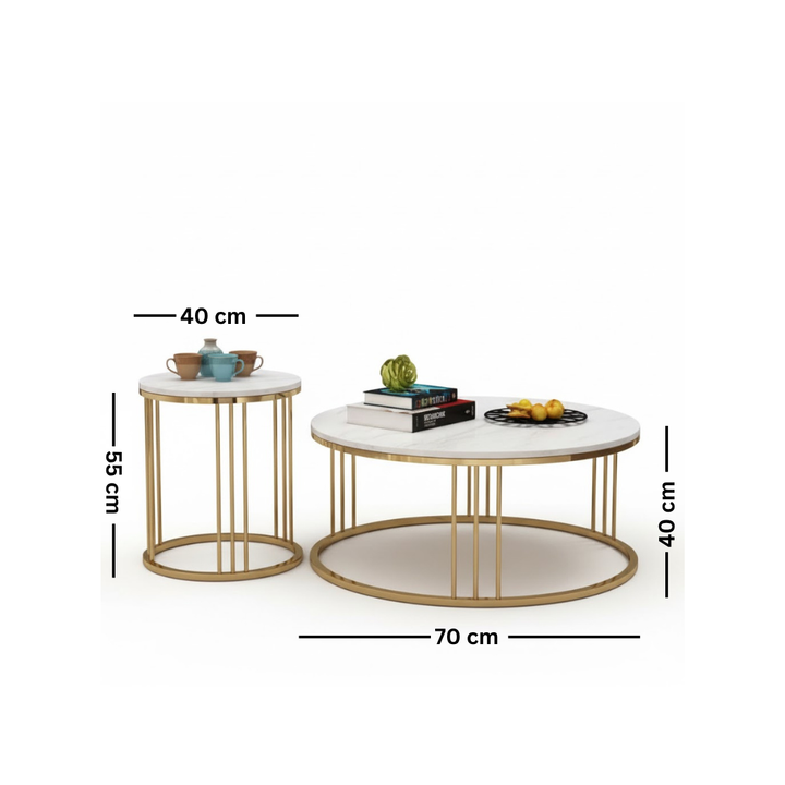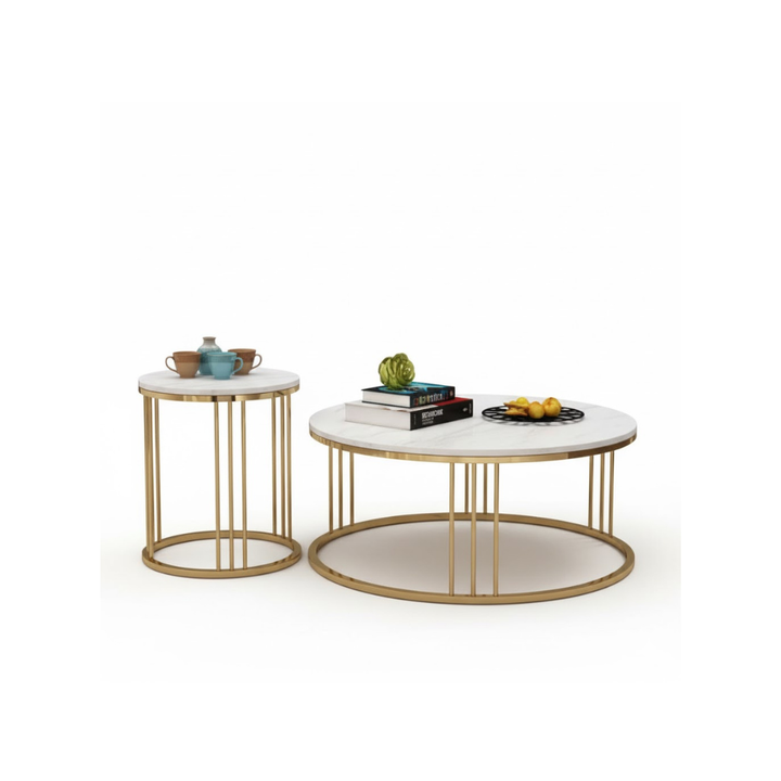 يأتي الطقم بسطح فاخر من رخام أبيض كرّارة طبيعي يمنح لمسة راقية لكل مساحة، مع طاولتين دائريتين بأحجام مختلفة يمكن استخدامهما معًا لإطلالة أنيقة أو بشكل منفصل لتوفير مرونة أكبر في الاستخدام.